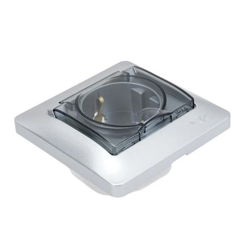 Розетка Systeme Electric (ранее Schneider Electric) серии Glossa (в сборе, цвет алюминий) одинарная с заземлением, шторками и крышкой подходит для сетей 250 В, на ток 16 А. - Изделие со степенью защиты IP44 обеспечит безопасность использования в ванной и на кухне. - Заземляющий контакт обеспечивает дополнительную защиту от удара электрическим током. При наличии заземления электрический потенциал уходит в землю, защищая человека. - Выполнен из материала PС+ASA, стойкого к УФ-излучению и появлению царапин.