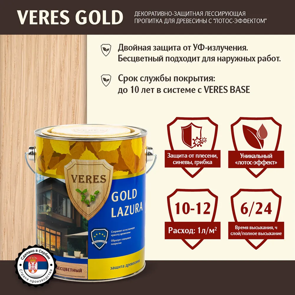 Высокоэффективная глянцевая тиксотропная декоративно-защитная лессирующая пропитка. Поставляется в 12 стандартных цветах, имитирующих натуральные оттенки древесины. Благодаря наличию дополнительных УФ-фильтров, бесцветную пропитку можно использовать для наружных работ. Обеспечивает покрытию эффект «лотоса» — придает грязе — и водоотталкивающие свойства. Надежная защита от УФ-излучения и атмосферных влияний. Тиксотропная — не капает с кисти и не образует подтеков. Срок эксплуатации покрытия до 10 лет (в системе отделки с грунтовочным составом Veres Base).