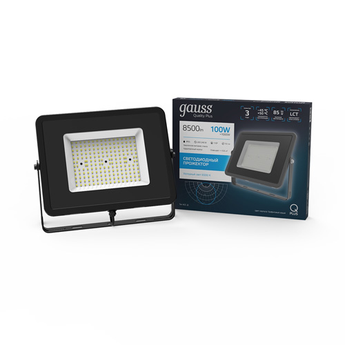 Прожектор уличный светодиодный Qplus 690511100 от российской фабрики Gauss украсит кафе, офис, магазин, веранду и беседку, фасад в стиле техно. Материал — алюминий, цвет серый. Рассеиватель из стекла с цоколем 1xLED и мощностью 100W освещает площадь до 20 кв. м. Индекс цветопередачи 70-79Ra, световой поток 8500 лм, угол рассеивания света 110 градусов. Цветовая температура лампочек 6500К с холодным белым оттенком свечения. Питание от сети 220V. Степень защиты от влаги и пыли IP65. Устанавливается на кронштейн.