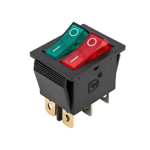 Выключатель клавишный 250V 15А (6с) ON-OFF красный/зеленый с подсветкой ДВОЙНОЙ предназначен для коммутации электрических цепей переменного тока напряжением до 250В. Клавишные (Рокерные) выключатели применяются в качестве комплектующих изделий различного электрооборудования (в сетевых фильтрах и удлинителях, аудио-оборудовании, блоках питания, электроустановках на различных производствах и многих других местах). Такой клавишный переключатель имеет два положения и две клавиши, что позволит раздельно коммутировать контактные группы. Принцип действия основан на перемещении клавиши в одну из позиций. Для переключения в нужное положение требуется приложить некоторые усилия на клавишу. Монтаж осуществляется без применения винтов на плоских панелях толщиной от 0.8мм до 3мм. Подключение контактов осуществляется плоской клеммой 6.6мм либо с помощью пайки.