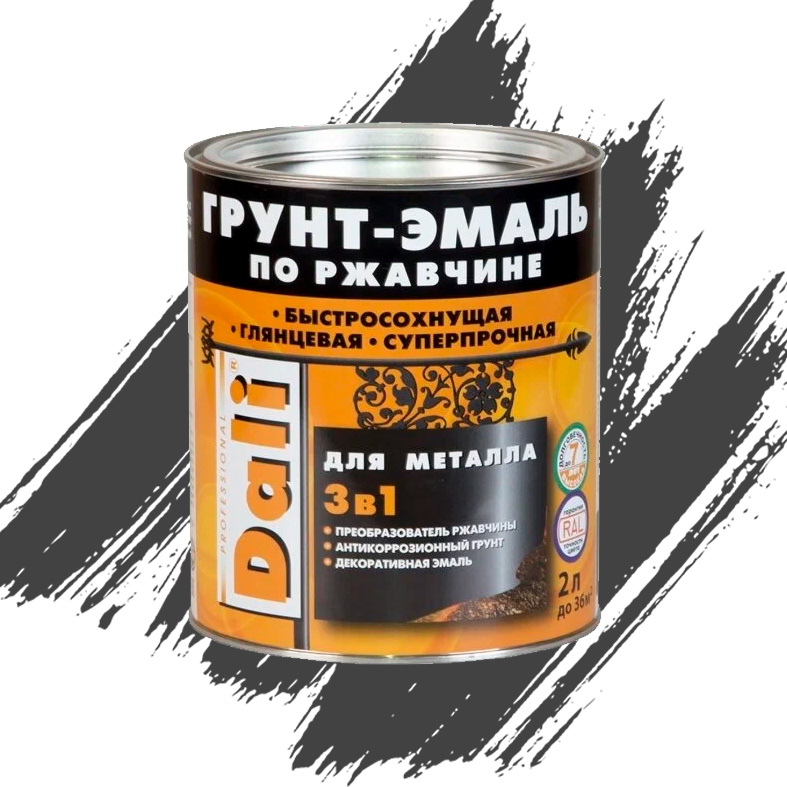 Применяется внутри и снаружи помещений по ЛЮБЫМ металлическим поверхностям, новым и ранее окрашенным: - стальным и чугунным (решетки, ограды, гаражи, ворота и пр.); - цветным металлам (цинк, медь, алюминий); - поверхностям из оцинкованного металла (профнастил) и нержавеющей стали. Допускается нанесение на деревянные поверхности влажностью не выше 20%, эксплуатируемые внутри помещений. Состав: модифицированная алкидная смола, восстановитель металла, ингибитор коррозии, пигменты, наполнитель, антикоррозионные и функциональные добавки, растворитель; Объем: 2 л; Цвет: серый графит (RAL 7024); Степень блеска: глянцевая; Расход: 12 - 18 м²/л; Способ нанесения: кисть, валик, распылитель; Разбавитель: универсальный растворитель Dali, сольвент, ксилол, Р646/647, не более 10%; Количество слоев: 2 - 3; Время высыхания «на отлип»: 3 ч; Межслойная сушка: 2 ч; Температура применения: от +8 °С; Термостойкость покрытия: до + 80 °С; Хранение: при температуре от -40 до +40 °С, не теряет свойств при замораживании. RAL 7024 Темно-серый