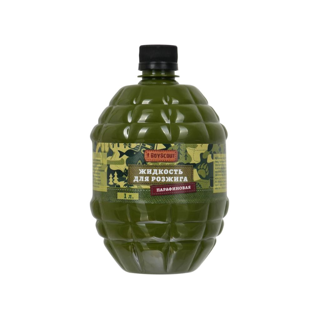 Парафиновая жидкость для розжига в оригинальной упаковке в виде гранаты-лимонки изготавливается на основе жидких парафинов по специальной технологии, не имеет запаха, разгорается медленным спокойным пламенем. Горит долго, без копоти.