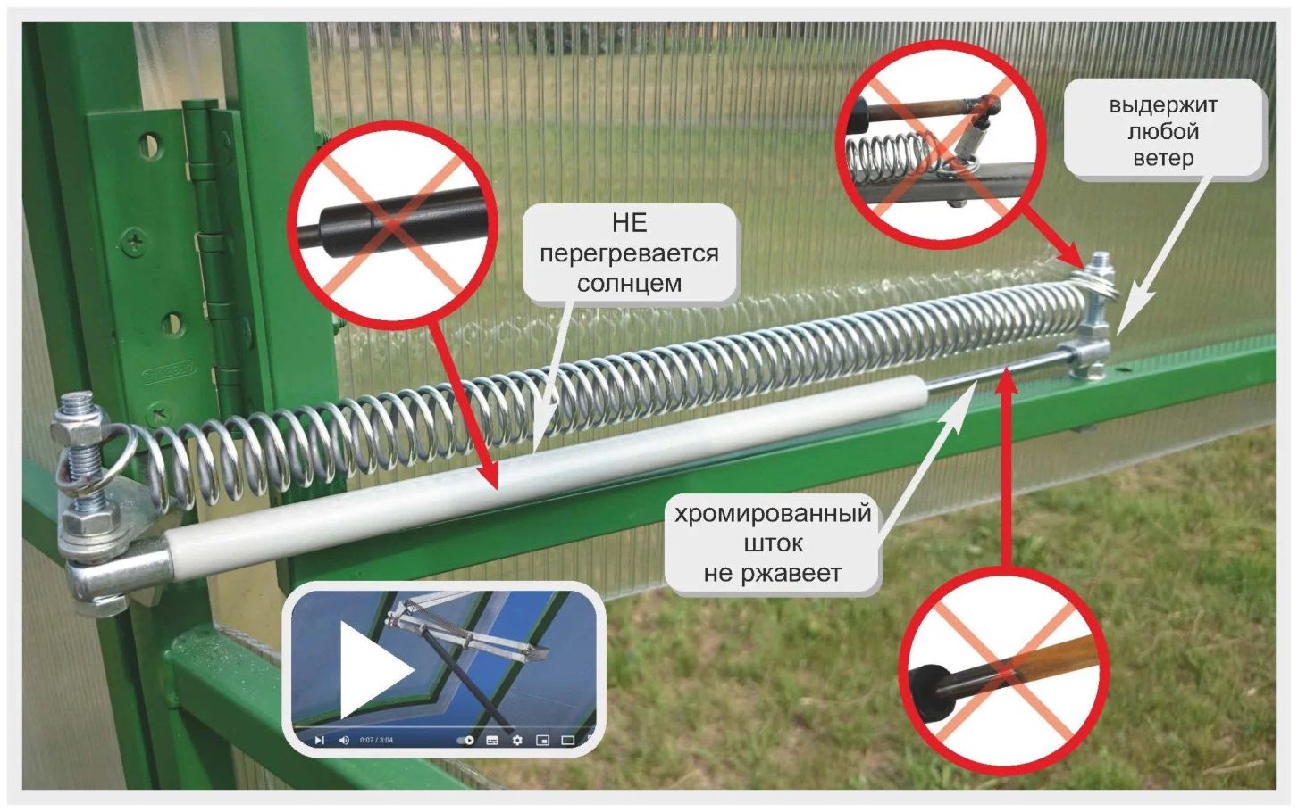 Тугое уплотнение штока препятствует раскачиванию створки ветром и обеспечивает длительный срок службы изделия.