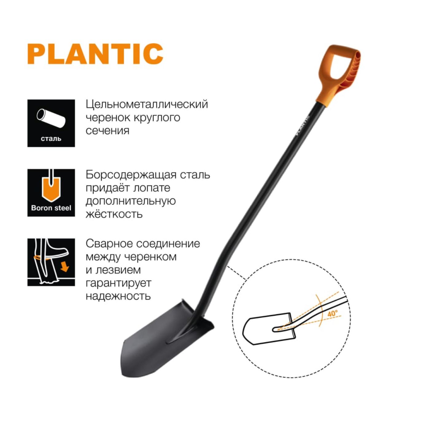 Использование борсодержащей стали придает лопате дополнительную жесткость и обеспечивает легкое проникновение в почву.
