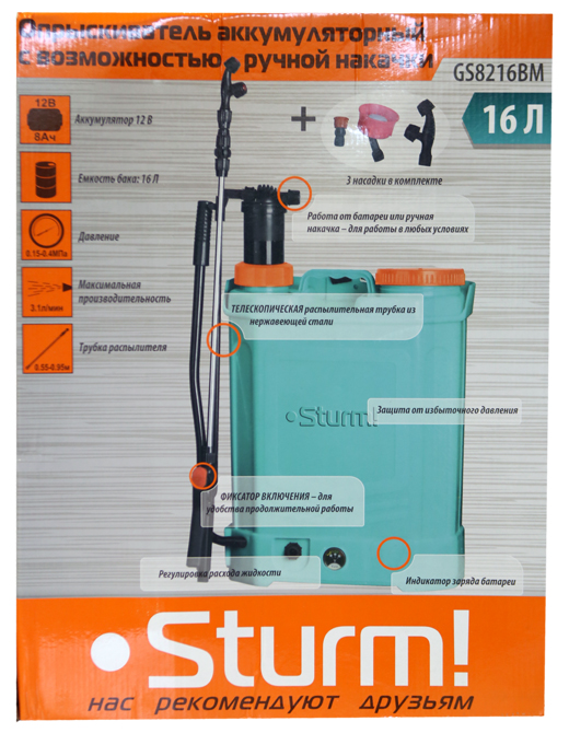 Аккумуляторный опрыскиватель Sturm! GS8216BM станет отличным вариантом для ухода за садовыми растениями. Модель с возможностью ручной подкачки подарит полную свободу действий во время обработки растительности, ведь для ее функционирования не требуется постоянный источник питания. Еще одним плюсом модели стала богатая комплектация, представленная большим количеством насадок для выполнения всевозможных работ, связанных с распылением жидкостей. Используйте его не только для борьбы с насекомыми-вредителями, но и, к примеру, для дезинфекции помещений.