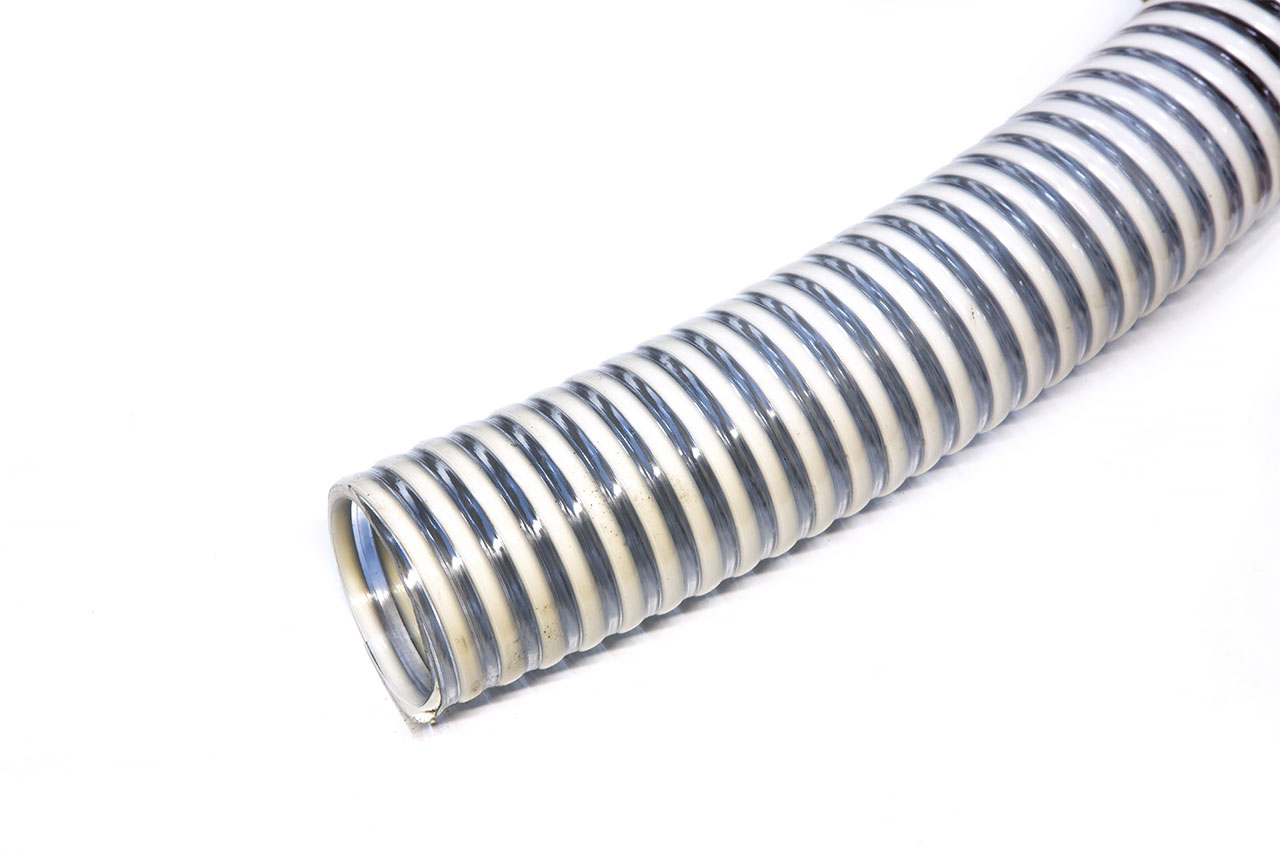 Описание: состоит из цилиндрической оболочки из пластифицированного поливинил хлорида с замоноличенным внутри ее прутком из непластифицированного поливинилхлорида. Внутренняя поверхность шланга гладкая, внешняя - волнистая. Цвет: прозрачная стенка, серая спираль. Изготовлены методом последовательной экструзии.