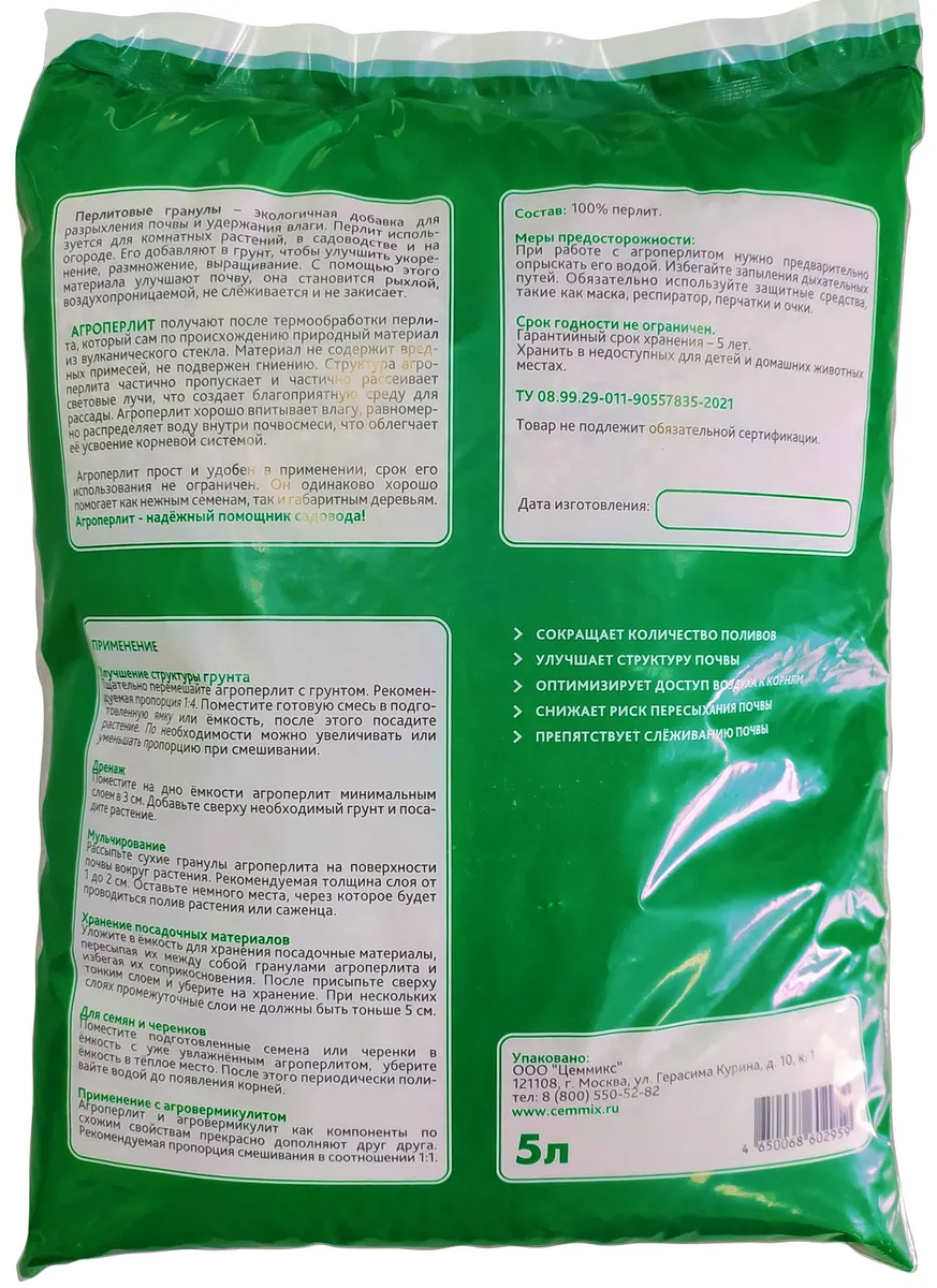Агротехнический перлит CEMMIX 5 л 82578135 используется для комнатных растений, в садоводстве и на огороде. Его добавляют в грунт, чтобы улучшить укоренение, размножение, выращивание. С помощью этого материала улучшают почву, она становится рыхлой, воздухопроницаемой, не слёживается и не закисает.