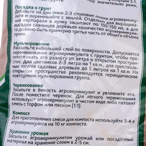 Вермикулит – это экологичный материал, который упрощает процедуру ухода за почвой и растениями. Он легко впитывает лишнюю воду и также легко отдаёт её, создавая оптимально влажную среду для питания корней растений. Применение вермикулита уменьшает количество поливов, ускоряет процессы прорастания семян и рассады, защищает корневую систему от вымерзания и перегрева, препятствует жизнедеятельности вредителей, тем самым создаёт качественный грунт для рассады и комнатных растений. Вермикулит обеспечивает надёжное хранение луковиц в зимний период, подходит для использования с любыми грунтами, абсолютно безвреден и экологичен, не содержит в своём составе токсичные примеси. Вермикулит прост и удобен в применении, срок его использования не ограничен. Он находит своё широкое применение в растениеводстве для любых культур в открытом и закрытом грунте.