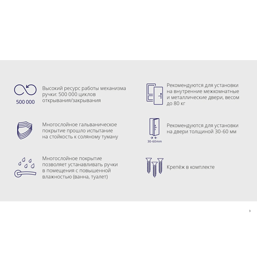 Высокий ресурс работы механизма ручки: 500 000 циклов открывания/закрывания Многослойное покрытие позволяет устанавливать ручки в помещения с повышенной влажностью (ванна, туалет)