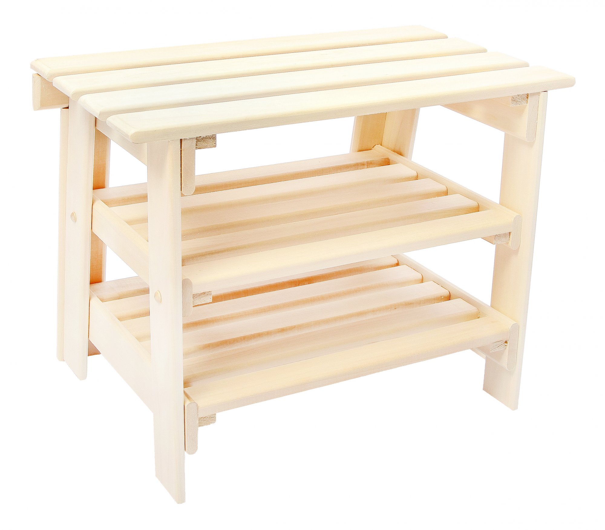 Универсальная по стилю и применению этажерка, которая отлично впишется в интерьер загородного дома, дачи или бани.