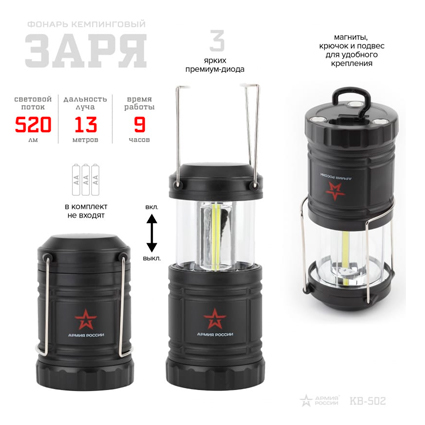 Кемпинговый светодиодный фонарь ЭРА Армия России KB-502 Заря на батарейках магнит крючок 3xAA Б0030188 - кемпинговый светодиодный фонарь-трансформер, изготовленный из экологичного и сверхлёгкого пластика. Три в одном: 1. универсальный фонарь с ручками - удобно освещать дорогу; 2. устойчивый светильник, который можно поставить на столе для получения света и создания уютной атмосферы на привале; 3. светильник по типу уличного фонаря - подвешивается к разным типам поверхностей при помощи магнита или крючка.