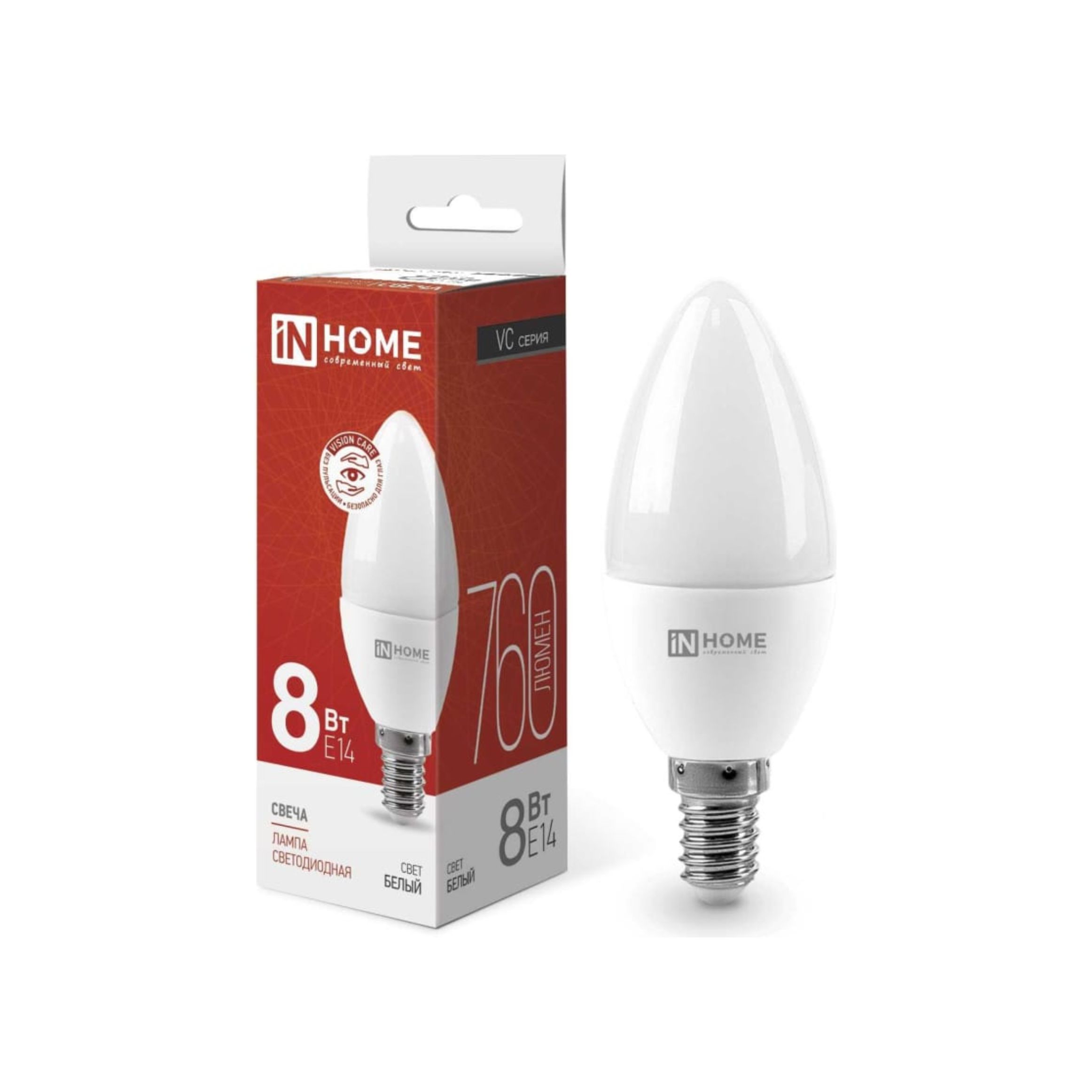 Светодиодная лампа IN HOME LED-СВЕЧА-VC 8Вт 230В Е14 4000К 760Лм 4690612020433, созданная по уникальной технологии VISION CARE, обеспечивает комфортный свет без вредных пульсаций, защищая глаза от усталости и раздражения.