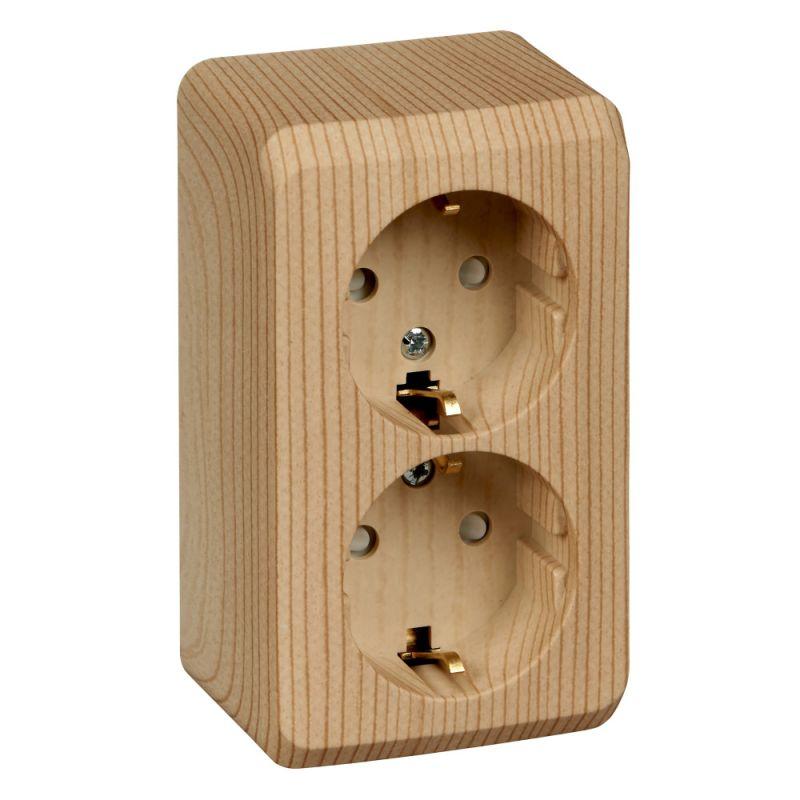 Розетка Schneider Electric ЭТЮД (сосна, открытой установки) двухместная с заземлением и шторками предназначена для применения в сетях до 250В, на ток до 16А. Двухместная розетка позволяет подключить два устройства в одном месте. Шторки и заземление обеспечивают дополнительную безопасность при косвенных прикосновениях. Изделия цвета Сосна обладают уникальным рисунком, напоминающим древесный сруб.
