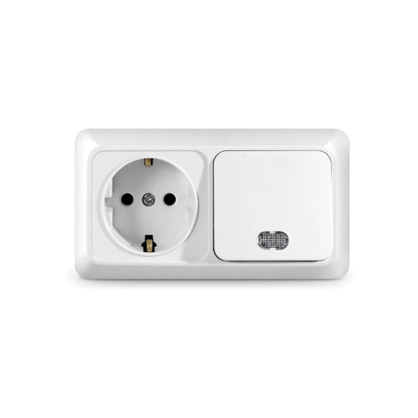 Блок ОП Олимп 1-кл. вык. с подсветкой + роз. с заземл. горизонт. бел. UNIVersal О0036 представлен потребителю в серии "Олимп".