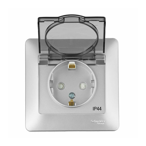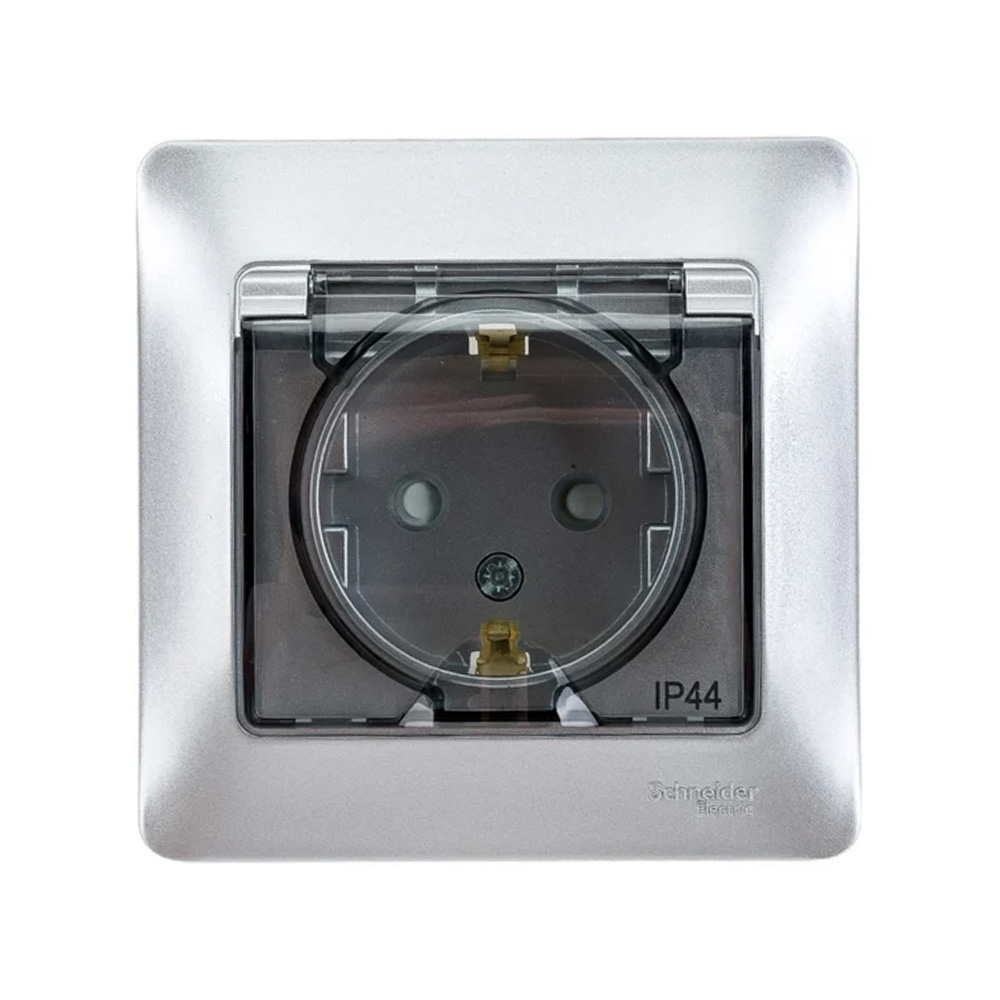 Розетка Systeme Electric (ранее Schneider Electric) серии Glossa (в сборе, цвет алюминий) одинарная с заземлением, шторками и крышкой подходит для сетей 250 В, на ток 16 А. - Изделие со степенью защиты IP44 обеспечит безопасность использования в ванной и на кухне. - Заземляющий контакт обеспечивает дополнительную защиту от удара электрическим током. При наличии заземления электрический потенциал уходит в землю, защищая человека. - Выполнен из материала PС+ASA, стойкого к УФ-излучению и появлению царапин.