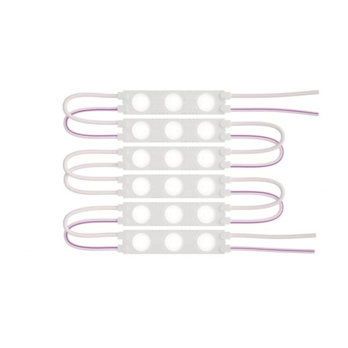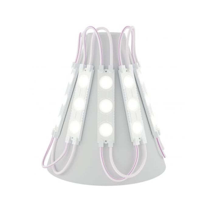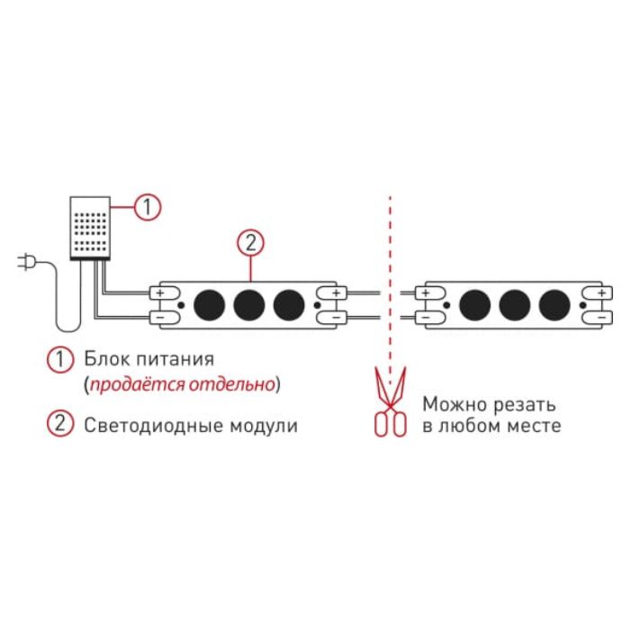 В упаковке находится 5 метровая лента из 40 модулей, на каждом модуле расположено по 3 светодиода с цветовой температурой 6500 К. Степень защиты модулей: IP65 применение внутри и снаружи помещений.