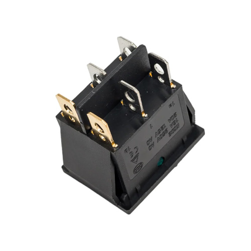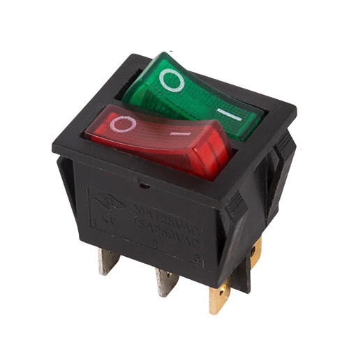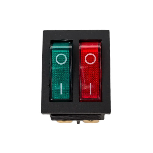 Выключатель клавишный 250V 15А (6с) ON-OFF красный/зеленый с подсветкой ДВОЙНОЙ предназначен для коммутации электрических цепей переменного тока напряжением до 250В. Клавишные (Рокерные) выключатели применяются в качестве комплектующих изделий различного электрооборудования (в сетевых фильтрах и удлинителях, аудио-оборудовании, блоках питания, электроустановках на различных производствах и многих других местах). Такой клавишный переключатель имеет два положения и две клавиши, что позволит раздельно коммутировать контактные группы. Принцип действия основан на перемещении клавиши в одну из позиций. Для переключения в нужное положение требуется приложить некоторые усилия на клавишу. Монтаж осуществляется без применения винтов на плоских панелях толщиной от 0.8мм до 3мм. Подключение контактов осуществляется плоской клеммой 6.6мм либо с помощью пайки.