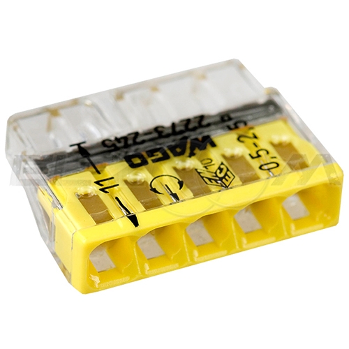 Соединительная клемма для быстрого монтажа WAGO 2273-245 5-ти проводная, 0,5-2,5 кв.мм, 450В, 24А, с пастой, 100 шт 2688 устанавливается в распределительную коробку. Корпус выполнен из пластика.