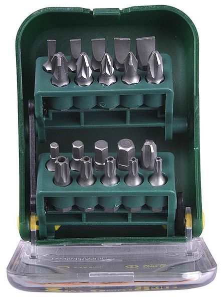 Набор бит 21 предмет KRAFTOOL применяется при использовании ручного или механизированного инструмента. Комплектуется 21 битой длиной 25 мм (SL 3, SL 4, SL 5, SL 6, SL7, PH № 1, PH № 2, PH № 3, PZ № 1, PZ № 2, PZ № 3, HEX3, HEX4, HEX5, HEX6, TORX (Hole: T10H, T15H, T20H, T25H, T30H)). Хром-ванадиевая сталь, используемая при изготовлении, обладает высокой прочностью и стойкостью у износу. Механизм подачи бит в боксе срабатывает при открытии крышки, что экономит время и упрощает замену насадок.