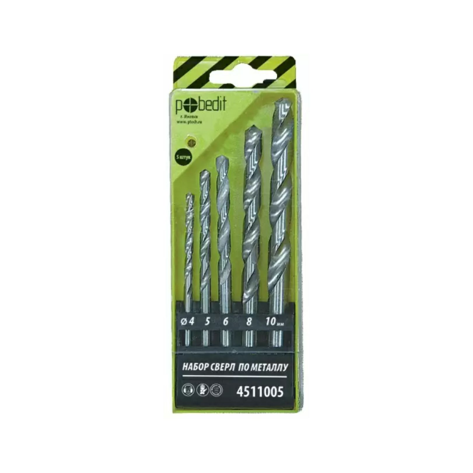 В набор входят сверла 4–5–6–8–10 мм. Сверла по металлу изготовлены из быстрорежущей стали (HSS).