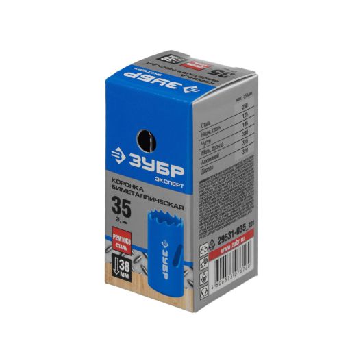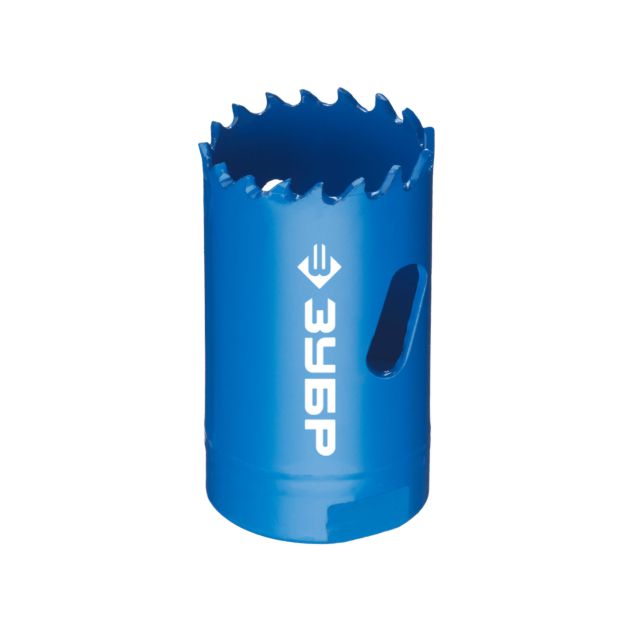 Коронка "Зубр" применяется в комплекте с дрелями. Она используется вместе с державкой и центрирующим сверлом для проделывания отверстий в различных видах древесины, в металлах и пластике. Отверстие получается точным и чистым благодаря специальному углу резцов и улучшенной геометрии. Коронка изготовлена из биметаллического сплава при помощи лазерной сварки. Зубья коронки сделаны из высокопроизводительной быстрорежущей стали HSS с 8% содержанием кобальта, что повышает срок эксплуатации. Агрессивное расположение зубьев позволяет достичь высоких результатов при работе этой коронкой. Максимальная глубина сверления 38 мм.