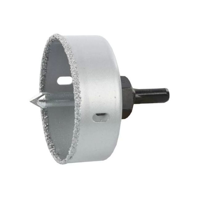 Коронка-чашка в сборе с державкой и сверлом (76х25 мм) ЗУБР 33360-076_z01 применяется для получения ровных отверстий в облицовочных материалах, а также в ячеистом бетоне, кирпиче и гипсокартоне. Используется на дрелях и легких перфораторах в режиме безударного сверления. Коронки-чашки с нанесением карбида вольфрама изготовлены из высокопрочной стали, имеют более широкий размерный ряд, чем кольцевые коронки, и позволяют сверлить средние и большие отверстия.