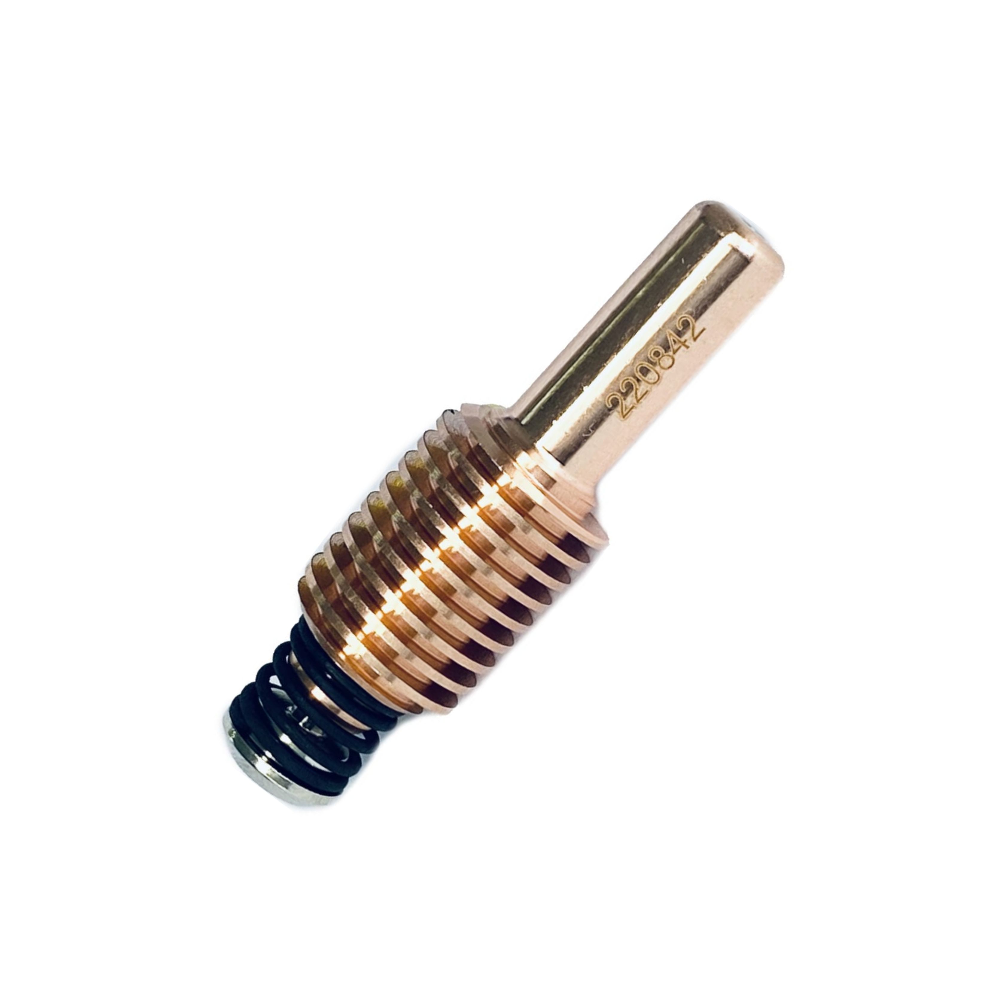 220842 Электрод подходит к системам PMX 45XP/65/85/105 и предназначен для механизированной плазменной резки с ЧПУ, ручной резки, а также строжки металла. Электрод 220842 рассчитан на резку металла толщиной до 50 мм на токах от 10 до 105 ампер. Электрод изготавливается с применением технологий, которые существенно увеличивают его надежность и долговечность. Спиралевидная форма электрода обеспечивает его наилучшее охлаждения и, как следствие, высокую стойкость. Конструктивно электрод выполнен вместе с пружинкой, которая обеспечивает работу механизма пневмо-поджига. Данный расходный материал больше всего подвержен износу при резке, как и сопло, поэтому рекомендуется менять его обязательно в паре с соплом, соответствующим силе тока резки.