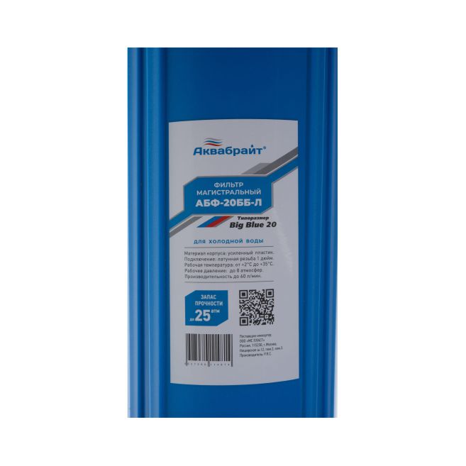 Магистральный фильтр аквабрайт модель АБФ-20ББ-Л изготовлен из полипропилена.
