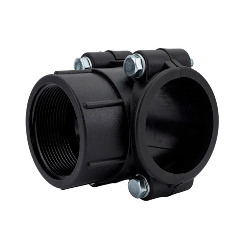 Болтовая седелка ПНД 63-2" предназначена для отвода второстепенной трубы от основной магистрали в полиэтиленовом водопроводе.