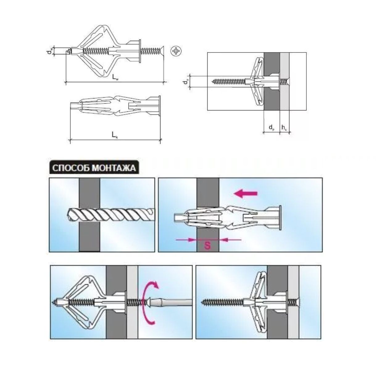 Дюбель «Бабочка» предназначен для крепления к гипсокартону, ГВЛ, ДСП и другим материалам (толщиной 10-12 мм) светильников, полок, плинтусов, выключателей, кабельных каналов и т.д. Дюбель "Бабочка" (10х50) может применяться и в случае использования двойного слоя гипсокартона или ГВЛ общей толщиной 20-24 мм.
