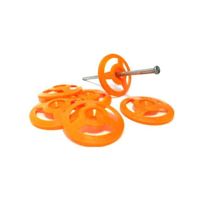 Шайба для утеплителя D50 рондоль пластмасс. (оранжевая) предназначена для крепления теплоизоляции (пенопласта, минеральной ваты, пенополистирола и т.п.) к основанию из дерева, ДСП, тонкой (0.7-1.0 мм) листовой стали.