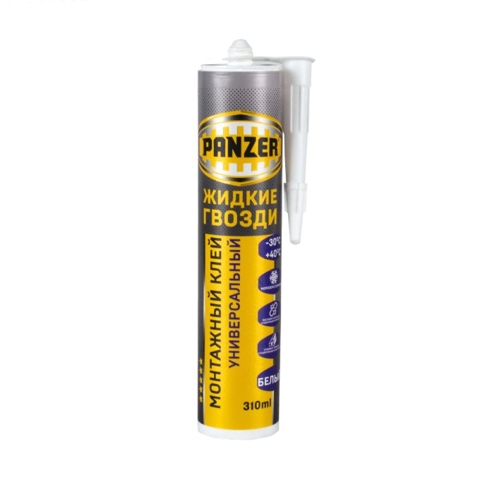 Клей монтажный Panzer Жидкие гвозди подходит для приклеивания декоративных панелей (кухонных фартуков) из ПВХ, АВС, ХДФ и МДФ; а также для приклеивания изделий из пенополистирола (особенно изделий из экструдированного пенополистирола), глазури, паркета, паркетной мозаики, керамики, напольных ковровых покрытий, дерева и древесноподобных материалов, пробки, искусственной кожи, бумаги, ткани и т.п. Применяется для склеивания вышеперечисленных материалов друг с другом и в разных комбинациях, а также для приклеивания этих материалов к бетонным, цементно-бетонным, гипсовым и кирпичным поверхностям.