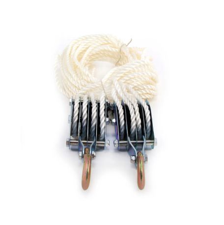 Полиспаст предназначен для увеличения силы прилагаемой для подъема или перемещения груза. Принцип работы полиспаста основан на действии блока и рычага. Полиспаст состоит из 2-х монтажных блоков с крюками по 4 ролика, последовательно огибаемых канатом длиной 20 м. Усилие, необходимое приложить к свободному концу каната будет в 8 раз меньше массы поднимаемого груза. При этом, высота подъема груза будет в 8 раз меньше длины каната и составит 2,5 м (20/8=2,5). Скорость подъема или опускания груза снизится за счет увеличения длины выбираемого каната в 8 раз.