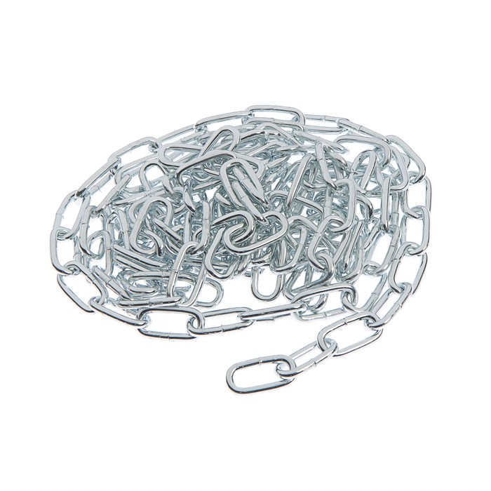 Звенья цепи изготовлены из стальных прутков диаметром 5 мм сварным способом. Цинковое покрытие защищает металл от коррозии — изделие можно использовать на улице. Цепь выдерживает рабочую нагрузку до 350 кг, разрывную — до 1400 кг.