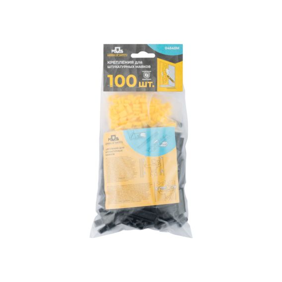 Набор: крепежная планка 100 шт. + фиксатор 100 шт. Упрощает процесс фиксации штукатурных маяков к основанию. Материал: пластик. Упаковка: п/э пакет с подвесом.