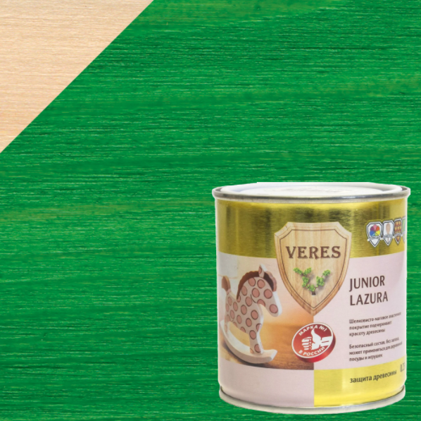 Лазурь Верес «Джуниор» 0.75 л цвет изумрудный - высокоэффективная шелковисто-матовая декоративно-защитная лессирующая пропитка для наружных и внутренних работ, в том числе для детских, игровых комнат, спален, а также детской мебели, игрушек, деревянной посуды, для деревянных поверхностей, соприкасающихся с продуктами питания.
