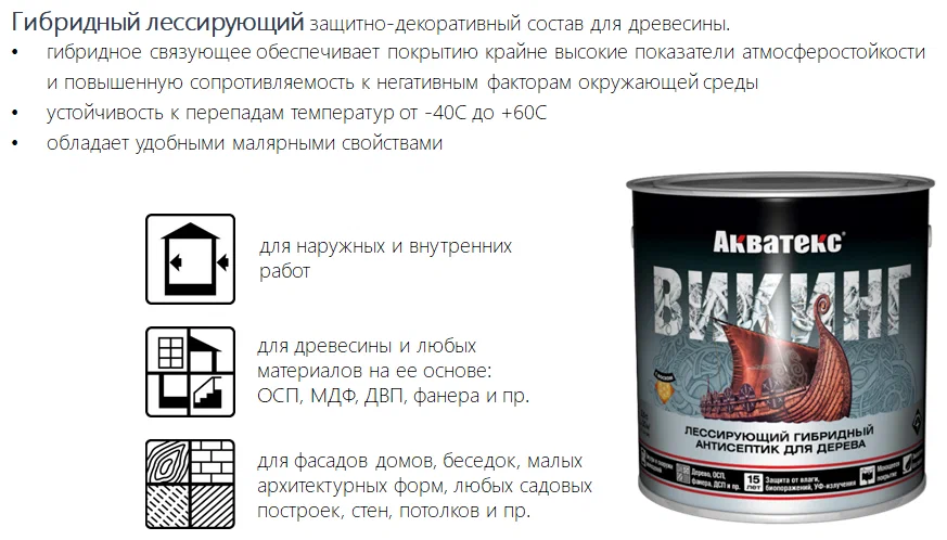 Применяется внутри и снаружи помещений по деревянным поверхностям и материалам на основе древесины (ДВП, ДСП, фанера и др.): фасады домов, беседки, садовые строения, малые архитектурные формы, стены, потолки, мебель, предметы декора и интерьера и пр. Область применения: - Максимально эффективная защита древесины от воздействия влаги, появления и распространения биопоражений (гниения, плесени, грибка, синевы), УФ-излучения и других атмосферных воздействий, в том числе в тяжелых климатических условиях; - Декоративная обработка древесины с целью получения благородного лессирующего (полупрозрачного) покрытия, сохраняющего видимой рисунок дерева: - Обновление деревянных поверхностей, ранее окрашенных алкидными или акриловыми составами. Не рекомендуется использовать для окраски полов и лестниц без нанесения финишного покрытия, обеспечивающего стойкость к истиранию и для окрашивания соприкасающихся поверхностей.""Гибридный лессирующий антисептик для дерева. Преимущества: - Покрытие с высокими показателями атмосферостойкости и повышенной сопротивляемости к негативным факторам окружающей среды; - Устойчив к сезонным перепадам температур от -40 до +60 ⁰С, повышенной и переменной влажности, интенсивной солнечной активности; - Благодаря наличию натурального воска, обладает грязе-водоотталкивающими свойствами; - Обеспечивает оптимальную защиту от выгорания: содержит УФ-фильтр UV-A и UV-B диапазонов, УФ-абсорберы и транспарентные пигменты; - Содержит активные антисептические компоненты последнего поколения, препятствующие появлению и распространению биопоражений; - Обладает повышенной эластичностью, не растрескивается и препятствует растрескиванию древесины; - Имеет отличные малярные свойства, не течет и не капает с инструмента; - Экологичен, без неприятного запаха, не содержит органических растворителей и опасных компонентов; - Прогнозируемый срок службы снаружи помещений - до 12 лет без предварительного грунтования, до 15 лет с предварительным грунтованием составом Акватекс Грунт-антисептик. Прогнозируемый срок службы внутри помещений - не ограничен; - Для очистки инструмента используется вода.