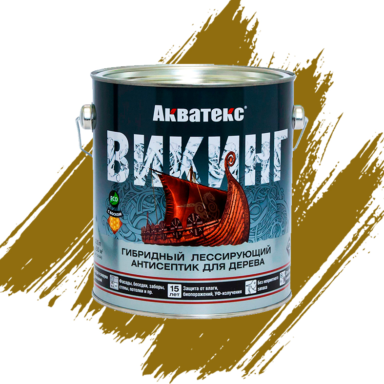 Гибридный лессирующий антисептик для дерева РОГНЕДА Акватекс Викинг (дуб; 2.5 л) предназначен для защиты древесины от воздействия влаги, появления и распространения биопоражений (гниения, плесени, грибка, синевы), УФ-излучения и других атмосферных воздействий, в том числе в тяжелых климатических условиях, для декоративной обработки древесины с целью получения благородного лессирующего (полупрозрачного) покрытия, сохраняющего видимым рисунок дерева. Не рекомендуется использовать для окраски полов и лестниц без нанесения финишного покрытия, обеспечивающего стойкость к истиранию и для окрашивания соприкасающихся поверхностей.