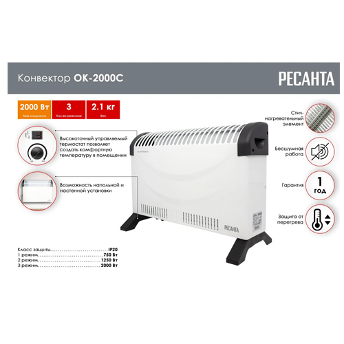 Конвектор Ресанта ОК-2000С – компактное, легкое и одновременно мощное устройство в линейке, позволяющее обогреть помещение площадью до 20 кв.м. Популярность электроконвекторов обусловлена их экономичностью, простотой использования и высоким КПД.