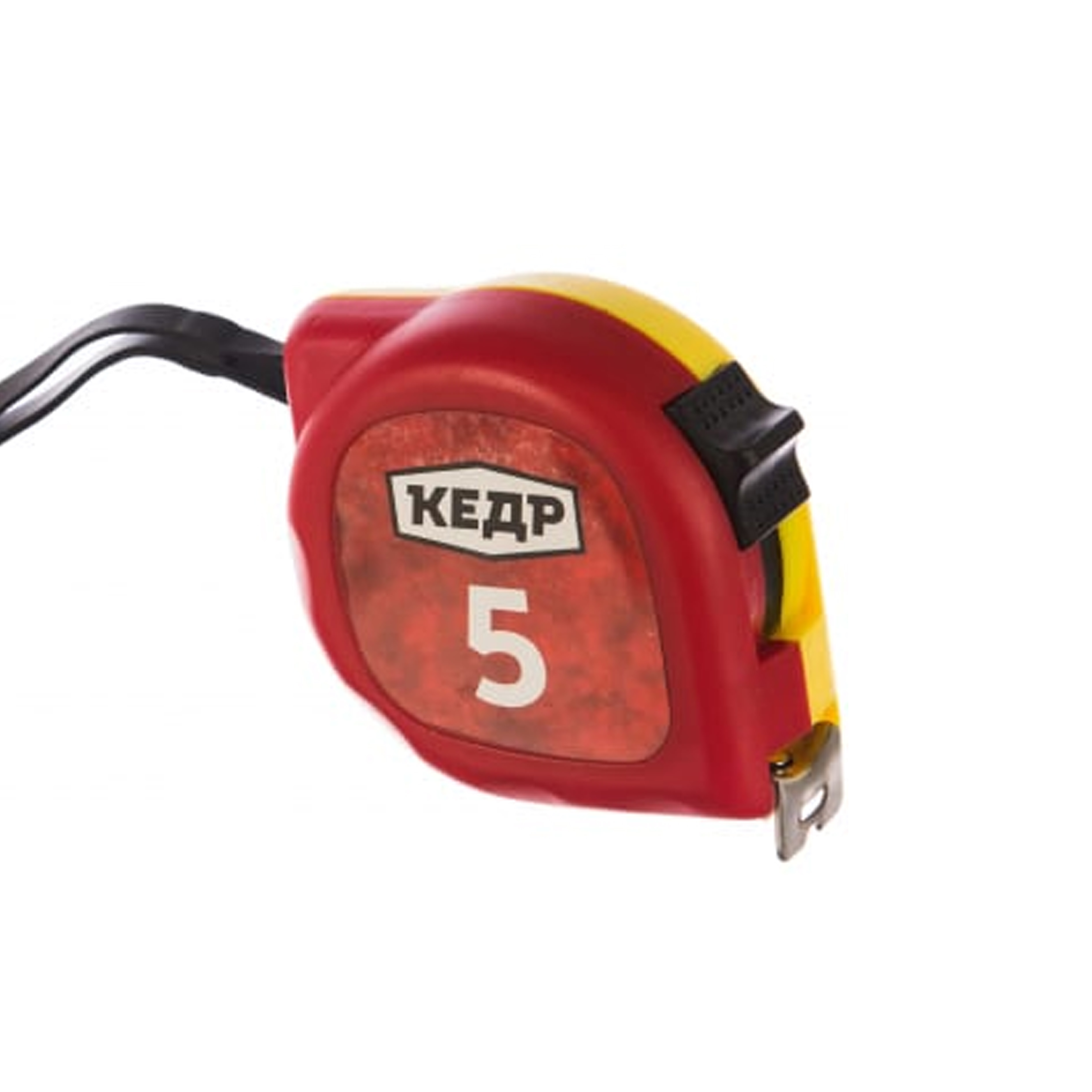 Рулетка имеет пластиковый корпус и полотно из упругой стали. Есть ремешок для руки и клавиша фиксации полотна.