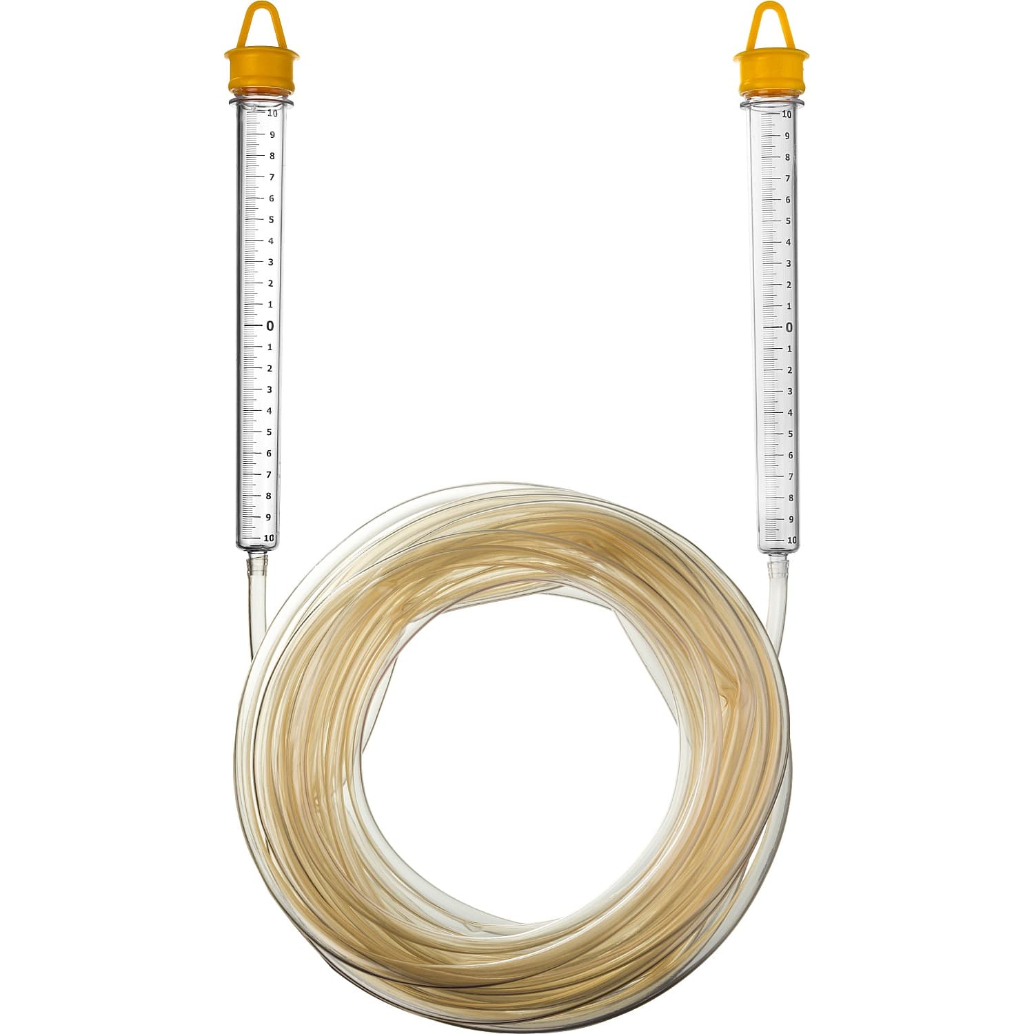 Водяной гидроуровень длиной 15 м с колбой диаметром 8 мм, оснащенный шкалой, работает согласно принципу сообщающихся сосудов. Прибор состоит из 2 пластиковых колб и длинного шланга диаметром 8 мм, который удобно использовать при возведении габаритных строительных и хозяйственных конструкций. С его помощью удобно наносить и проверять засечки в горизонтальной плоскости.