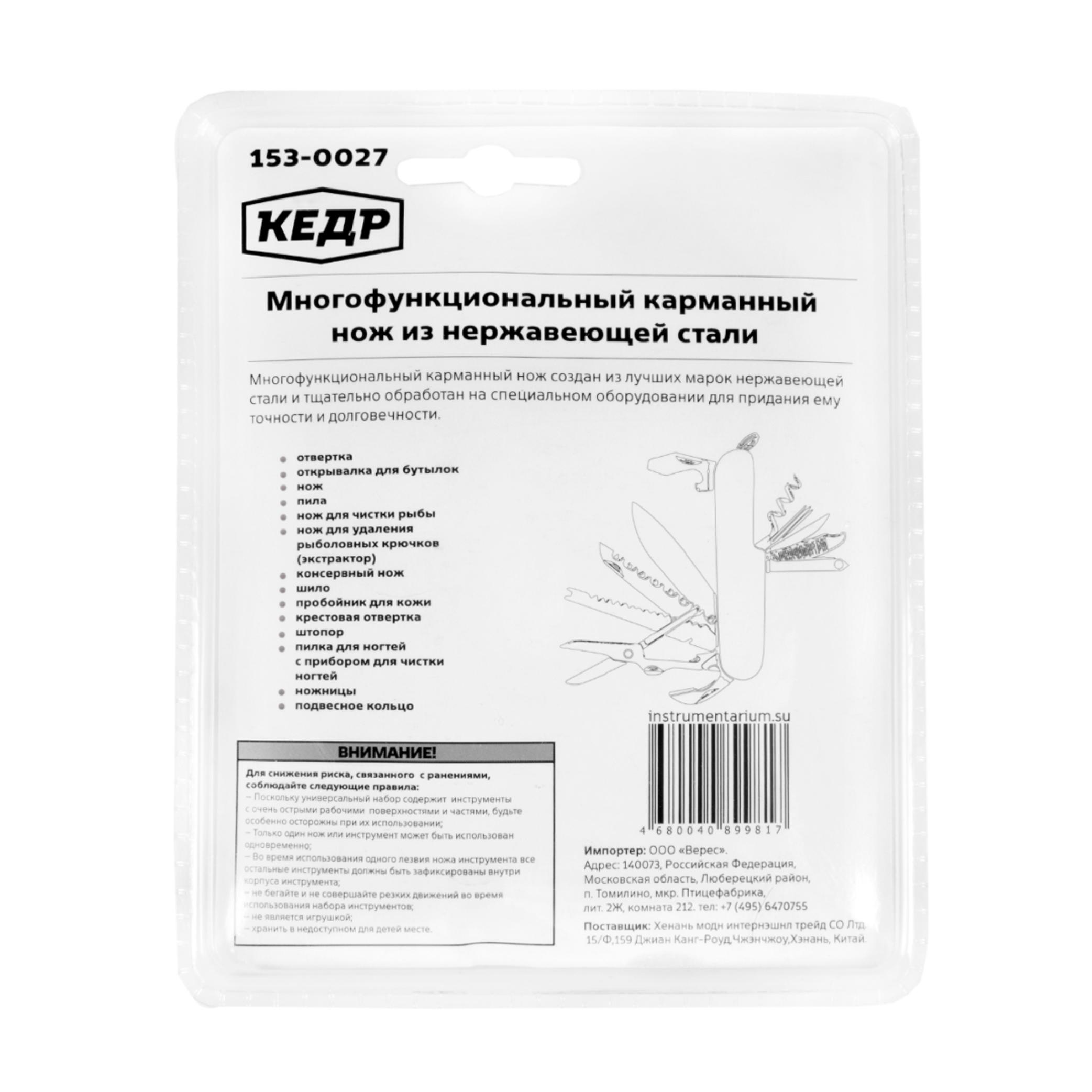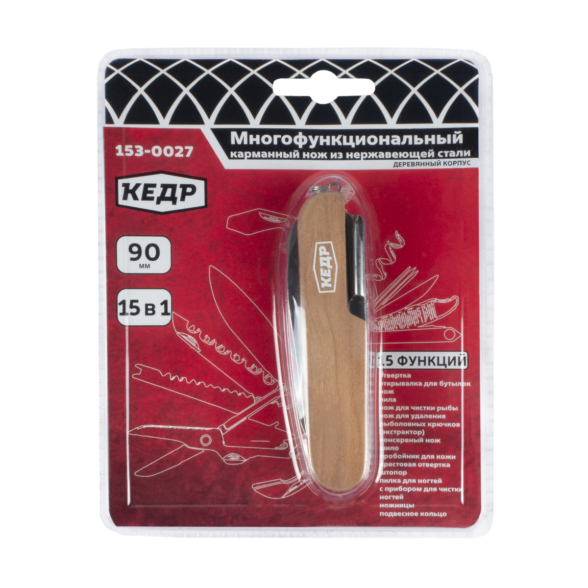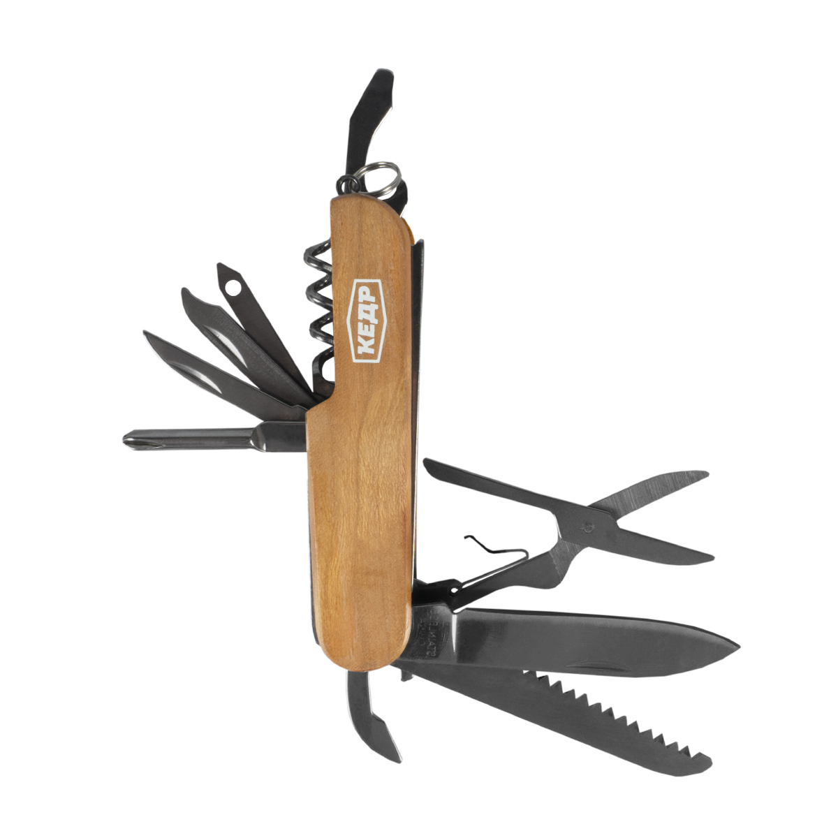 Многофункциональный нож станет отличным помощником в хозяйстве и в туризме. Ручка изготовлена из дерева, благодаря этому не будет скользить в руке. В конструкцию входят 15 инструментов, которые помещаются в рукоятке.