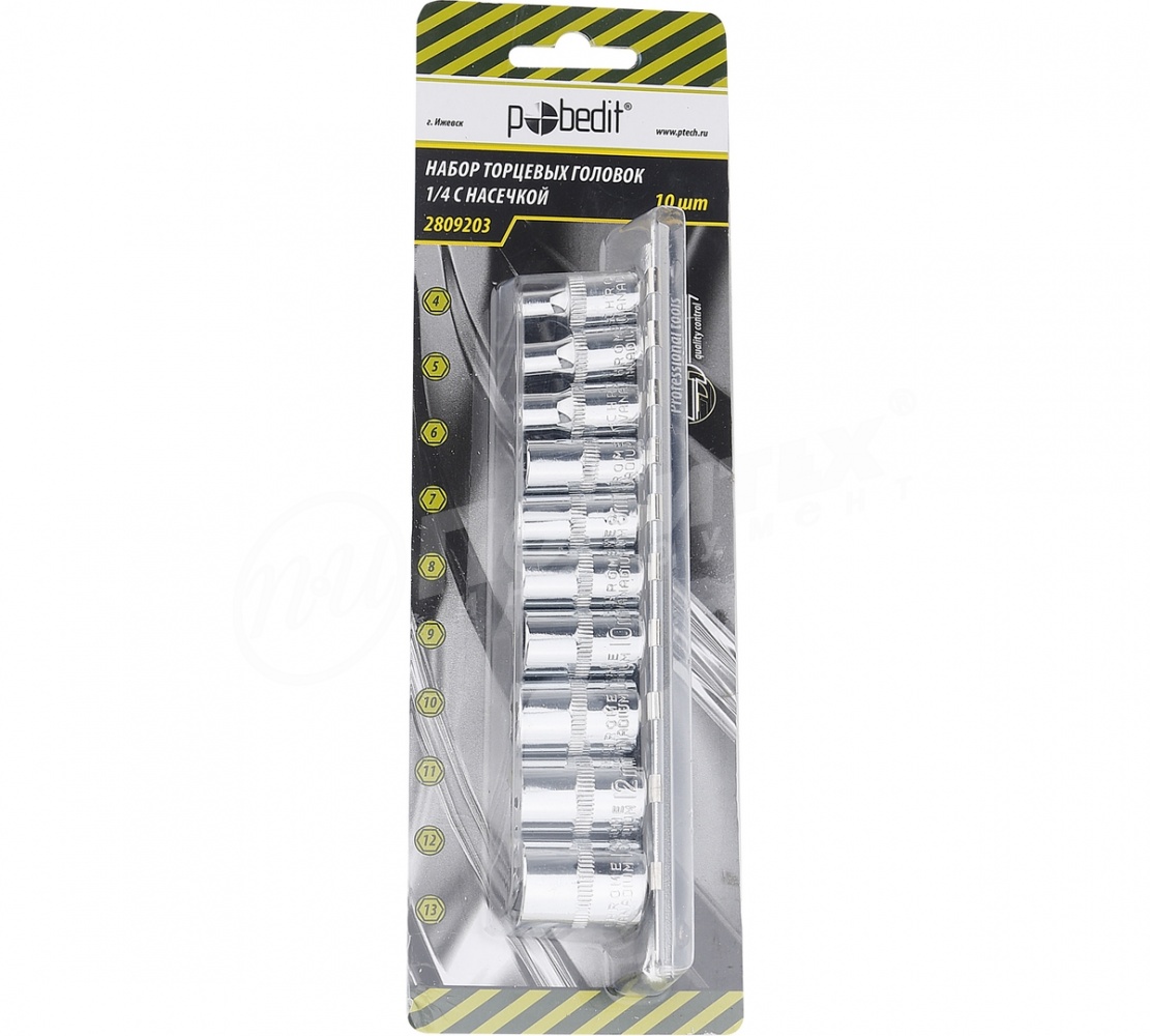 Набор 1/4 торцевых головок (6-гран. торц. головок на мет. планке 10 пр: 4,5,6,7,8,9,10,11,12,13 мм, CrV)