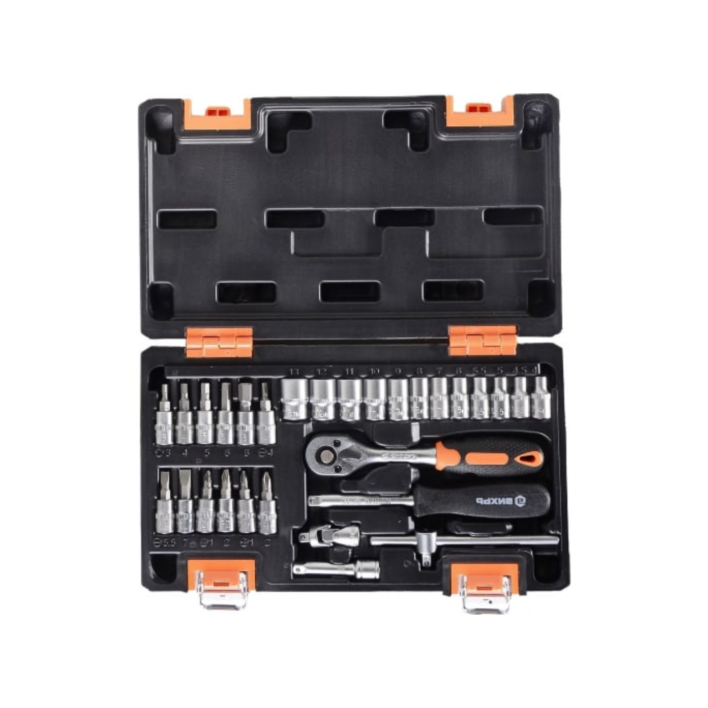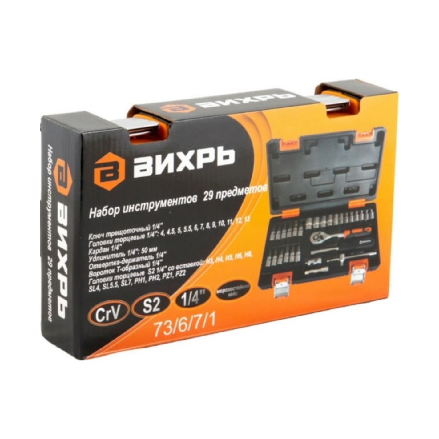 Набор инструментов 1/4 дюйма, CrV, пластиковый кейс 29 предмета Вихрь 73/6/7/1 подойдет для работ с крепежом. В состав входит эргономичная трещоточная рукоятка.