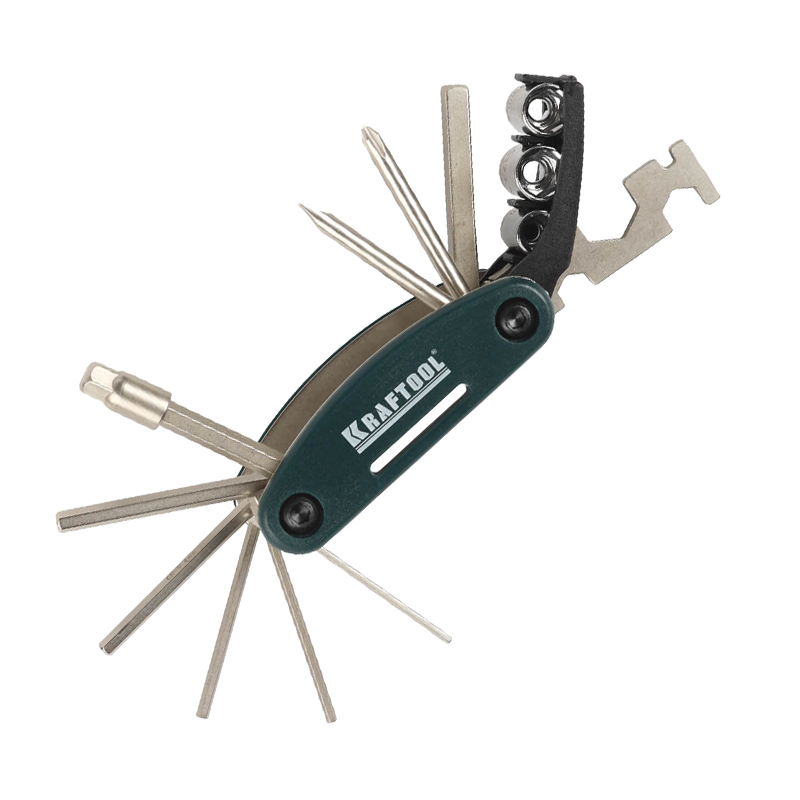 Набор KRAFTOOL для обслуживания велосипеда 16-в-1 - сразу несколько инструментов ремонта и содержания в порядке велосипедной техники. Складной комплект можно легко возить с собой - на всякий случай.