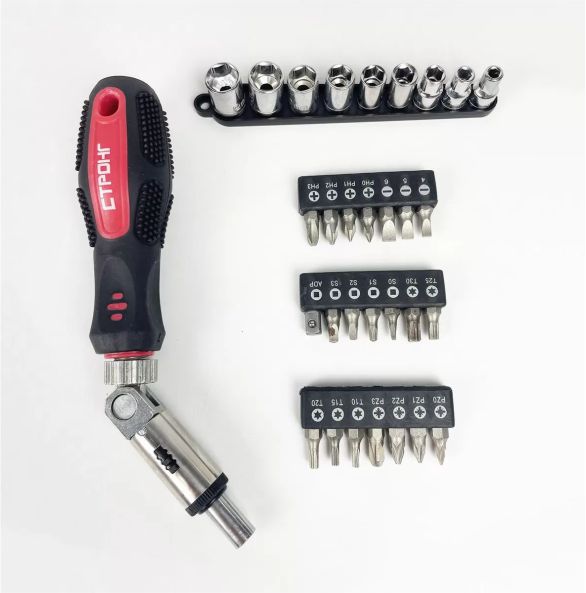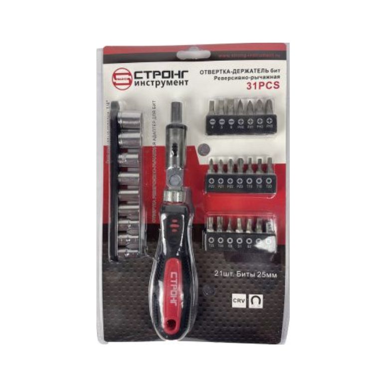 Отвертка битодержатель реверсивно-рычажная с набором бит и головок 31 предмет, набор состоит из самой реверсивной отвертки с битодержателеми поворотным рычагом, 20 штук бит длиной 25 мм с квадратным (четырёхгранным), прямым и крестообразным шлицем, а также со шлицем типа Звездочка или TORX размерами S0 S1 S2 S3 SL4 SL5 SL6 PH0 PH1 PH2 PH3 PZ0 PZ1 PZ2 PZ3 T10 T15 T20 T25 T30, адаптера под головки 1/4 дюйма и 9 штук торцовых головок 1/4" размером 4 5 6 7 8 9 10 11 12 мм. Следует отметить наличие в наборе достаточно редких четырехгранных бит типа "S", что является его положительной отличительной от подобных наборов чертой. Набор будет отличным подспорьем в работе как домашних умельцев, так и профессионалов.