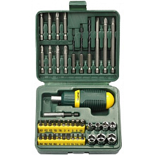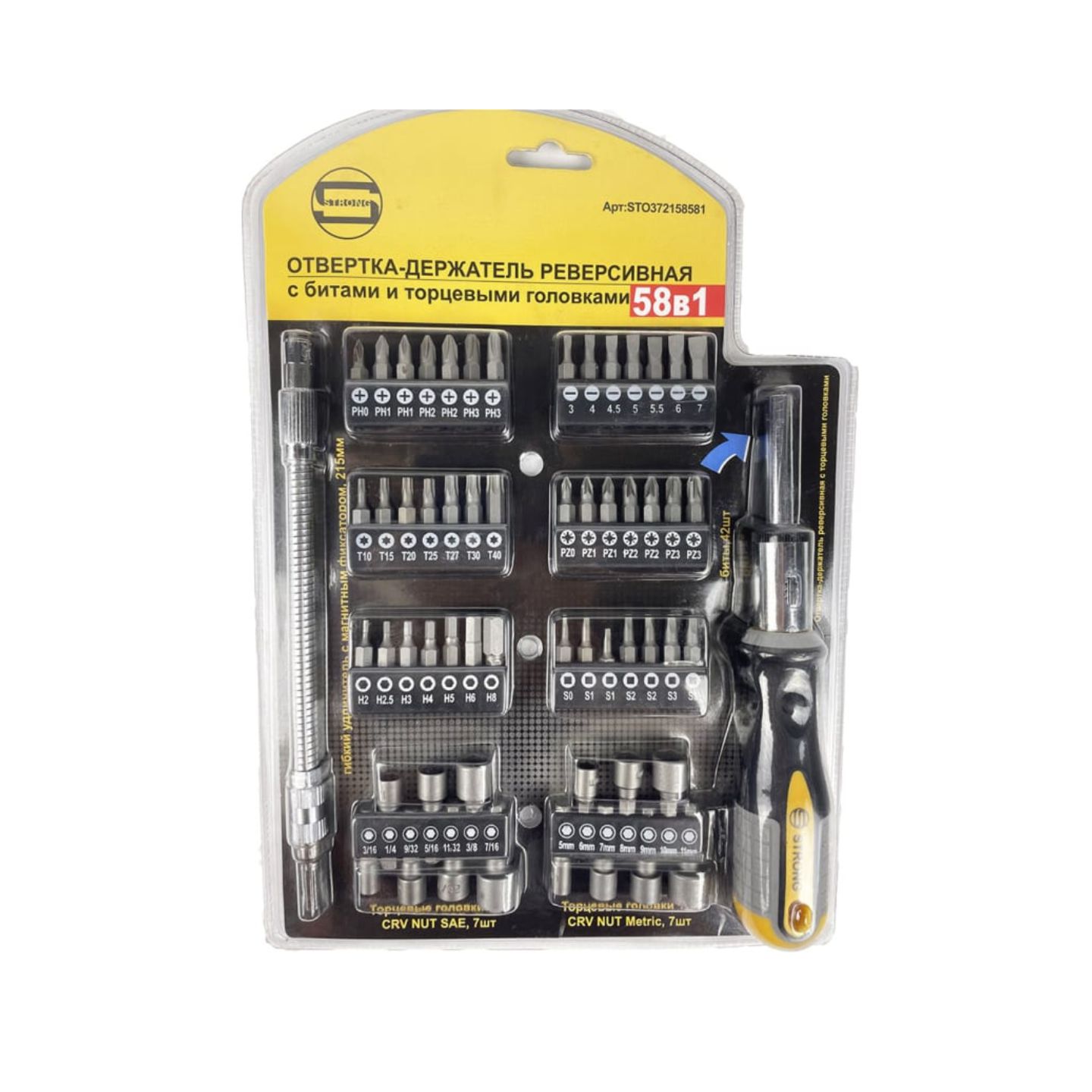 Набор головок и бит с реверсивной отверткой Strong предназначен для выполнения монтажных и демонтажных работ с резьбовыми соединениями: шурупами, саморезами и т. д. Насадки выполнены из качественной хромованадиевой стали, биты имеют намагниченные наконечники. Трехкомпонентная прорезиненная рукоятка с магнитным держателем не скользит и не прокручивается в ладони, чем обеспечивает комфорт при работе. Реверсивный механизм срабатывает по/против часовой стрелки/е, имеет фиксацию положения. Для удобного хранения и транспортировки насадок предусмотрены пластиковые подставки. В основании инструмента есть отверстие для подвеса.