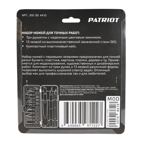 Комплект ножей PATRIOT PKS-16 со сменяемыми лезвиями для резки тонких материалов. В комплекте идёт 13 стальных полотен разной формы и три рукояти разной толщины.