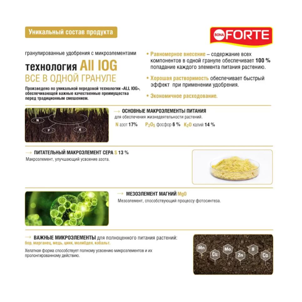 • Равномерное внесение – содержание всех компонентов в одной грануле обеспечивает 100 % попадание каждого элемента питания растению.