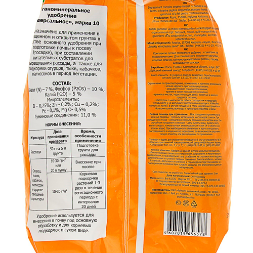Удобрение органо-минеральное удобрение для огурцов, тыкв, кабачков, патиссон, 1 кг. Органоминеральное комплексное удобрение. Предназначено в качестве основного удобрения, которое обеспечивает длительное и полноценное питание Огурцов, Тыкв, Кабачков, Патиссонов от рассады до плодоношения. Содержит макро- и микроэлементы, торф, гуматы, микробилогическую добавку. Дает полноценное минеральное питание растениям, стимулирует развитие корневой системы, ускоряет рост корней, повышает плодородие почвы и урожайность действует как почвоулучшитель, улучшает качество и лежкость плодов. Минеральное комплексное гранулированное удобрение пролонгированного действия, производится на основе низинного торфа, в состав которого входят гуминовые вещества, макро- и микроэлементы. Оптимальное соотношение элементов питания повышает морозоустойчивость и сопротивляемость растений болезням; выступает как стимулятор роста растений и биозащита от болезней; обеспечивает не только прирост урожая, но и улучшает питательную ценность продукции. Органоминеральная оболочка защищает растения от избыточного повышения солевой концентрации почвенного раствора в зоне развития корневой системы растений. Такие свойства делают это удобрение эффективным, в том числе, и стартовым удобрением для многих культур.